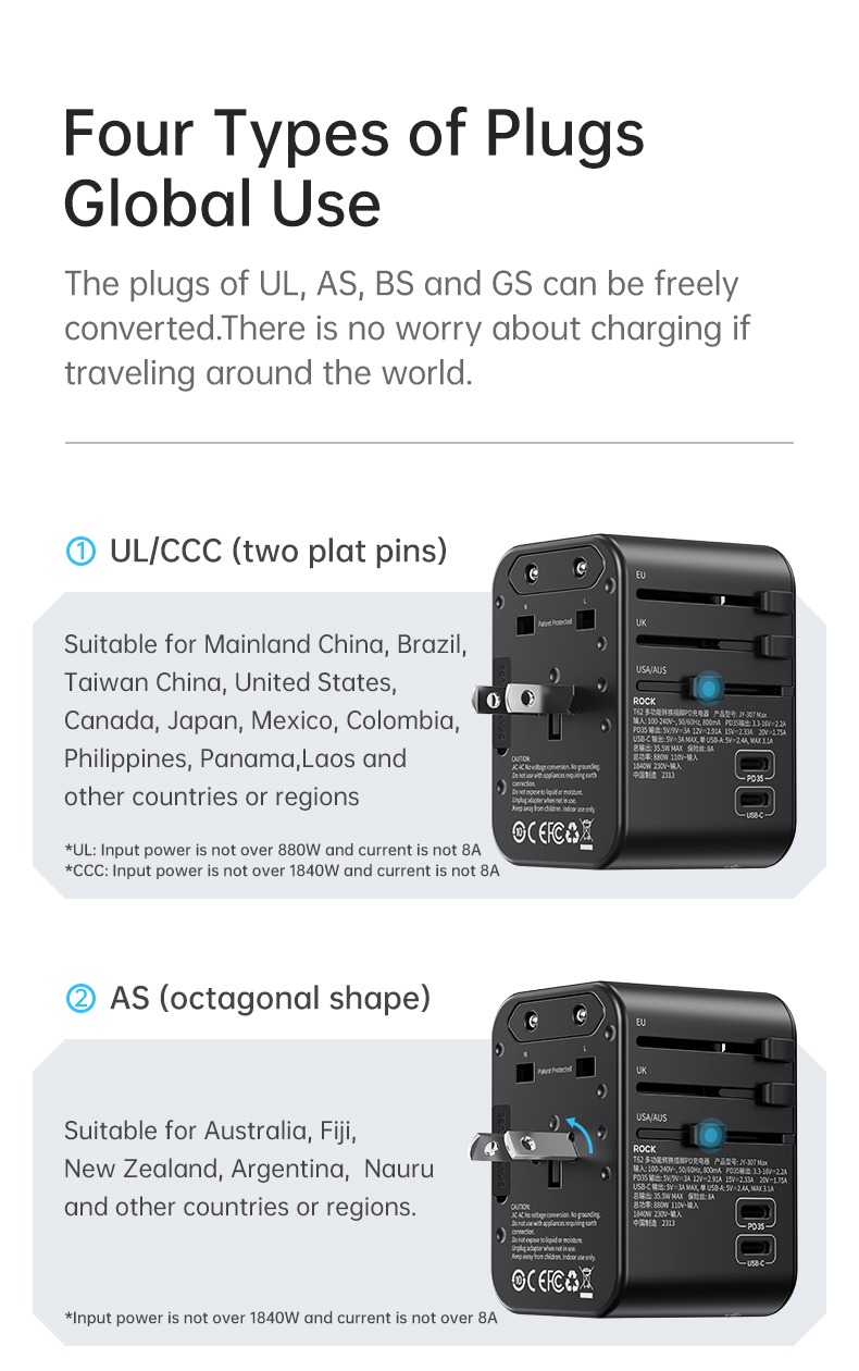 Rock Universal World Travel Adapter PD 35.5W with 2-Type-c and 3-Type-A Ports