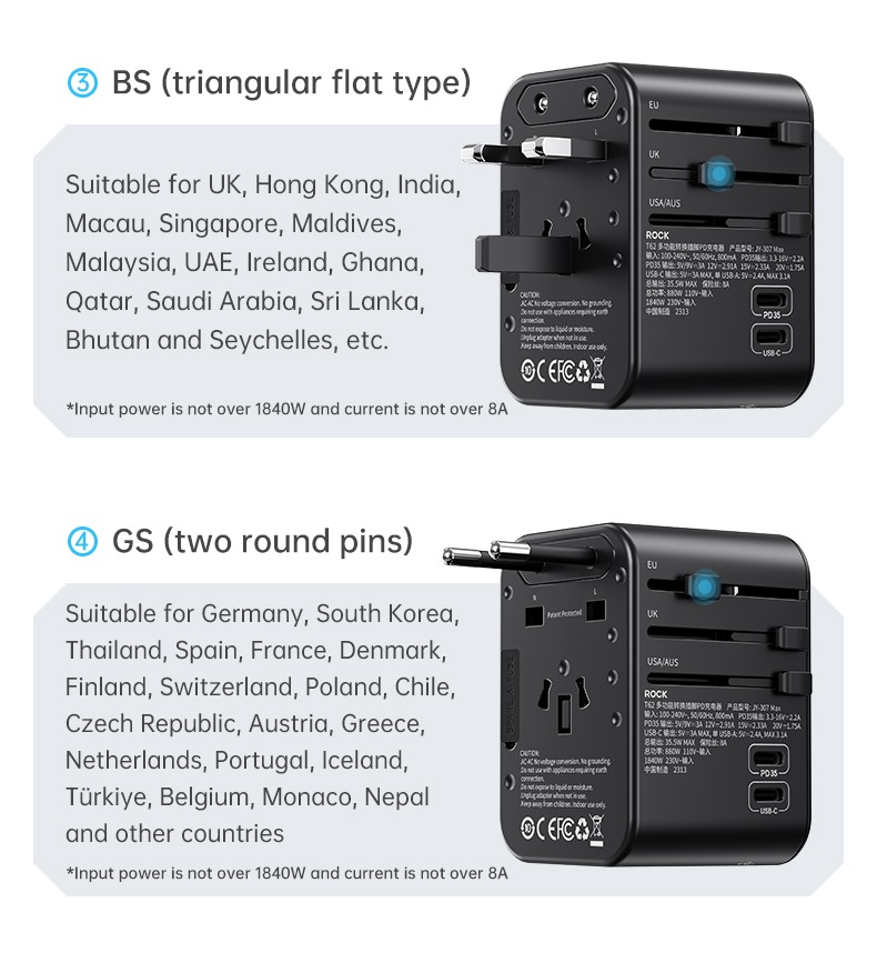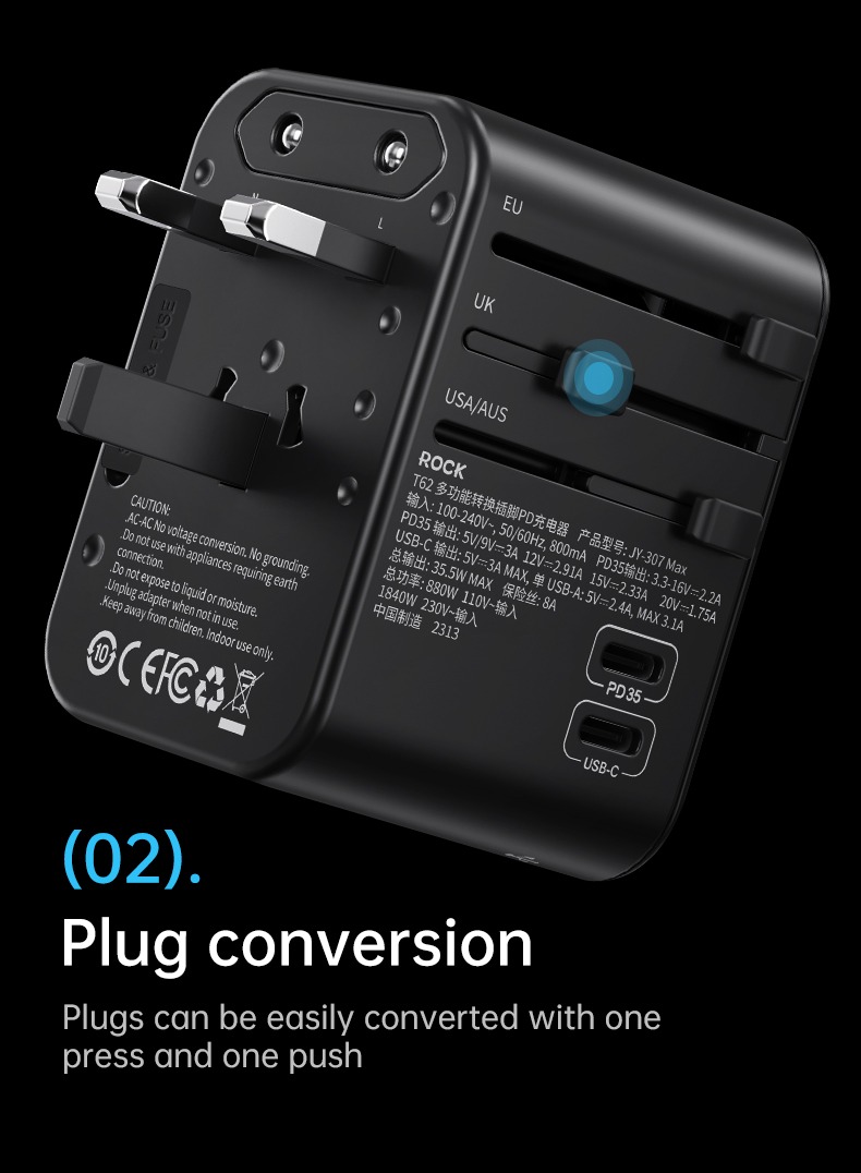 ROCK UNIVERSAL WORLD TRAVEL ADAPTER PD 35.5W WITH 2XTYPE-C 3XUSB-A PORTS-BLACK