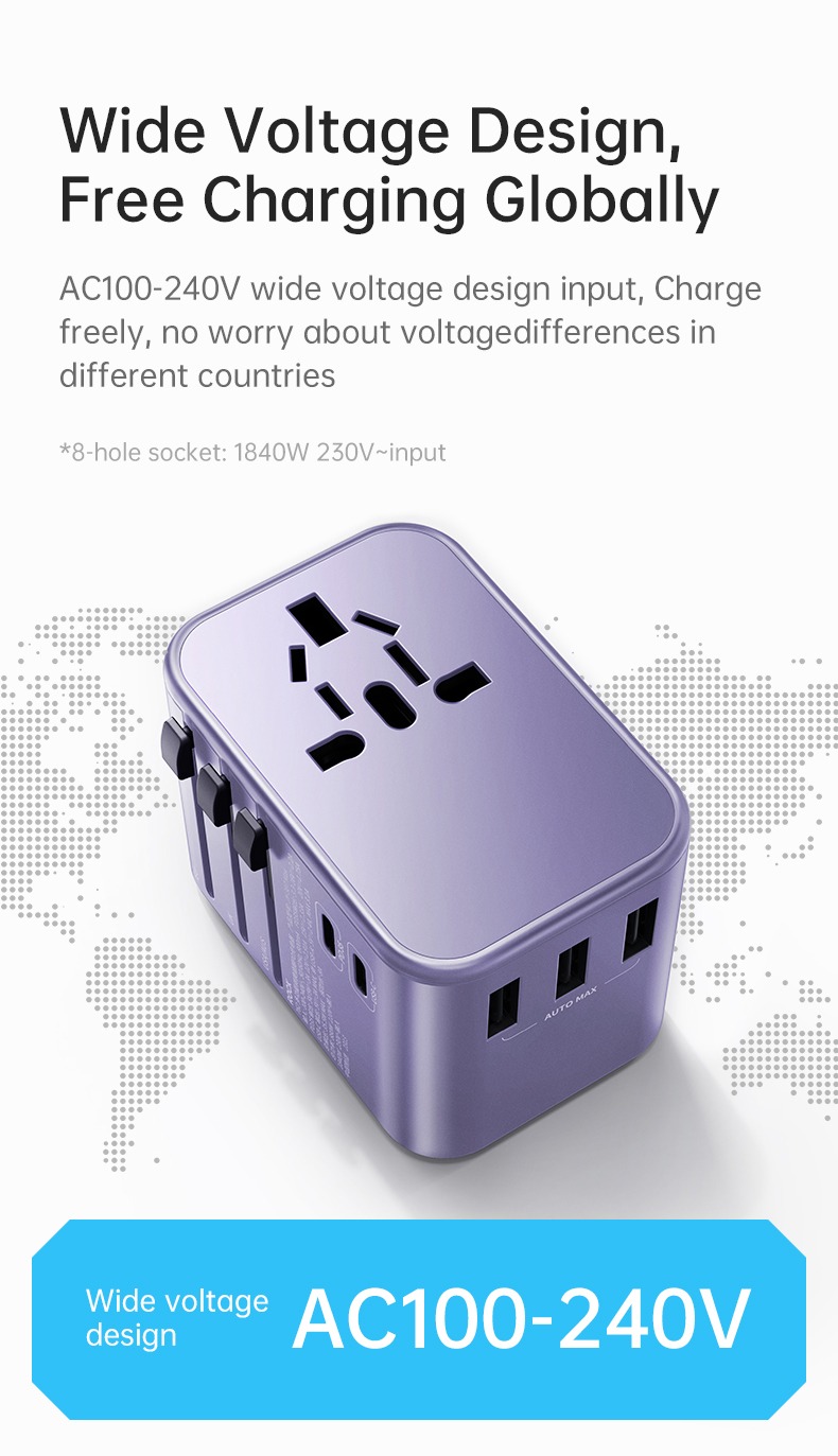 - AC100-240V wide voltage design input,Chargefreely, no worry about voltagedifferences indifferent countries