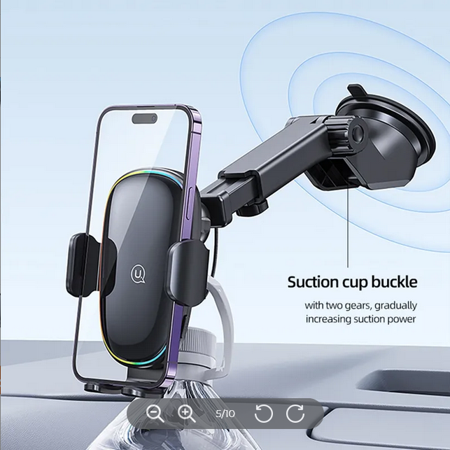 Material: ABS + PC Weight: About 133g (not includes suction cup holder/air vent clip) Size: 119*74*56mm Input: 5V?2A 9V?2A 12V?2A Wireless Output: 15W (Max) Conversion Rate: About 75% Induction Distance: 8mm (Max) Installation Method: Clip Style/Suction Cup Style Fixed Position: Air Vent/Center Console/Windshield Applicable Models: Support 4.5-6.7 inches phones (65mm?phone width?85mm) Including: Wireless charging holder*1, Suction cup holder*1, Air vent clip*1, Type-C charging cable*1 Notes: ?To make the wireless output more powerful, it is recommended to use with a car charger with QC/PD fast charging function. ?The specific output power of wireless charging depends on the car charger and the device itself. ?The wireless charging function is available only for devices that support Qi wireless charging standard. Features: ? One-touch induction, put down and auto clamp. ? Max up to 15W, wireless fast and safe charging. ? Time delay capacitor design, convenient in use. ? Two installation methods, with colorful light.